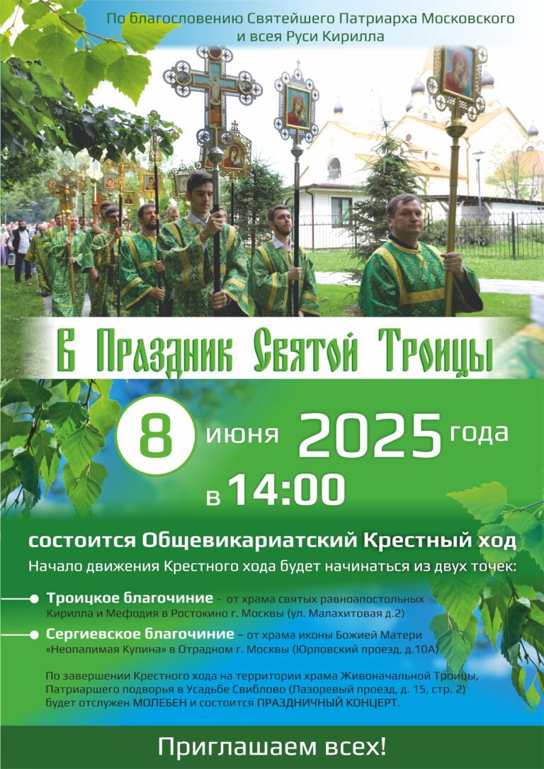 По завершении Крестного хода на территории храма Живоначальной Троицы, Патриаршего подворья в Усадьбе Свиблово (Лазоревый проезд, д. 15, стр. 2) будет отслужен молебен и состоится праздничный концерт.
