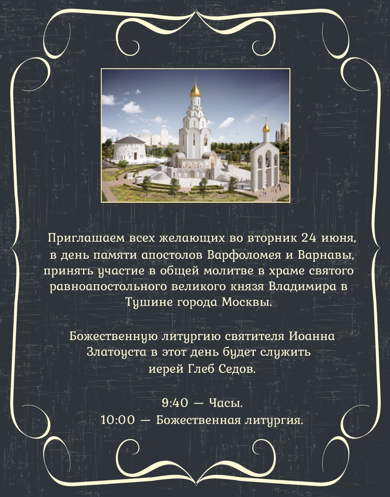 Приглашаем всех желающих во вторник 24 июня, в день памяти апостолов Варфоломея и Варнавы, принять участие в общей молитве в храме святого равноапостольного великого князя Владимира в Тушине города Москвы.