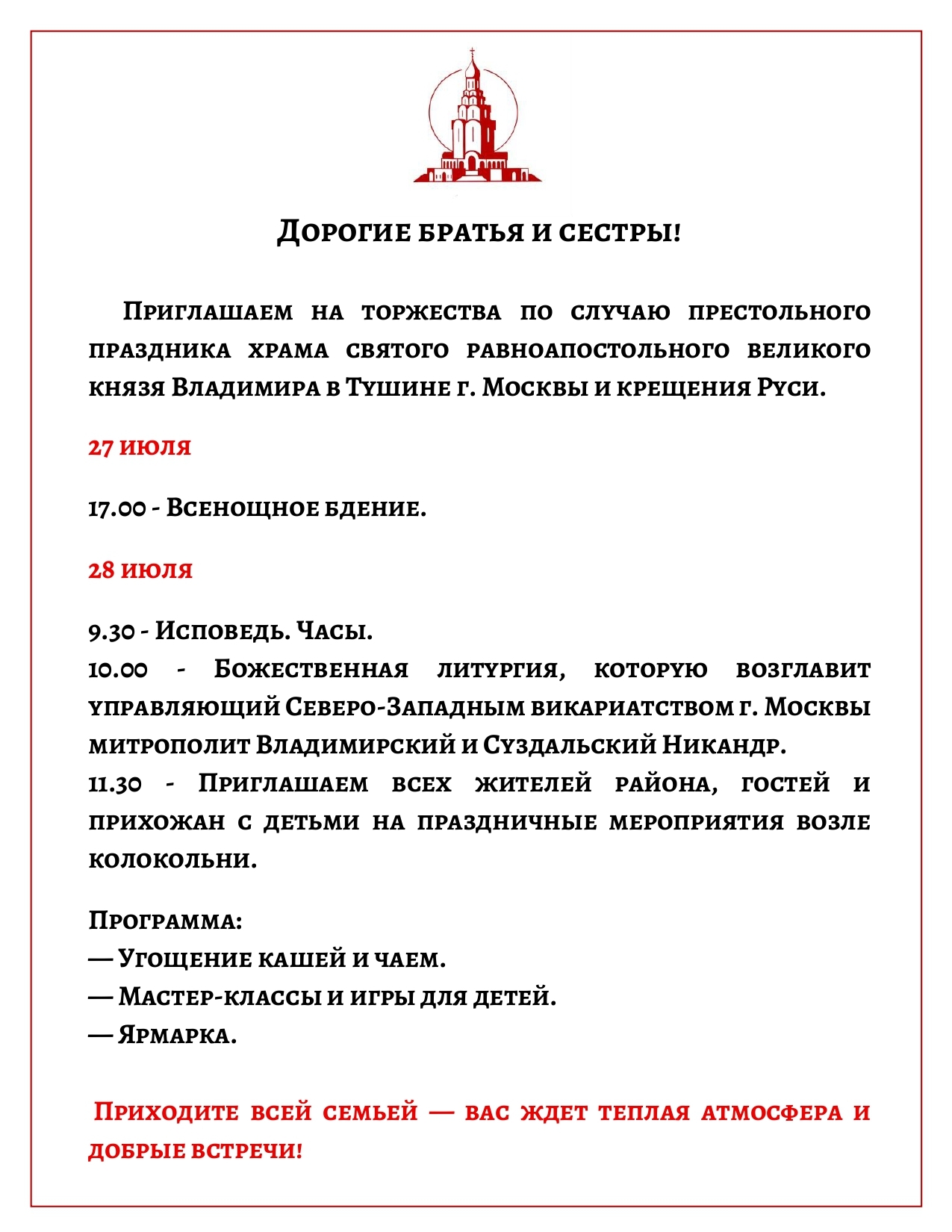 Приглашаем на торжества по случаю престольного праздника храма святого равноапостольного великого князя Владимира в Тушине г. Москвы и крещения Руси.